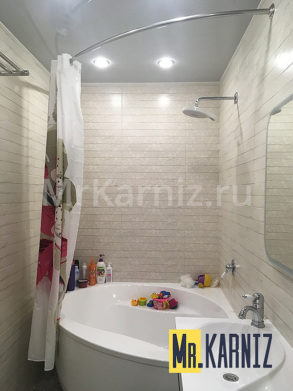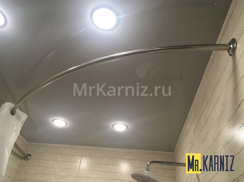 Карнизы, реализуемые нашей компанией, имеют два основных крепления для стены и два дополнительных для потолка. Последние не используются при обустройстве ванных комнат с натяжными конструкциями.