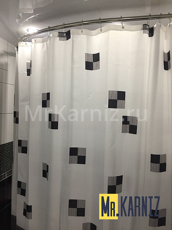 Прямоугольная (квадратная) штанга производится из цельной трубы. Подходит также для оформления сантехники круглой или овальной формы. Главное, чтобы ванна была расположена вплотную к одной из стен. В ином случае карниз не справится с главной функцией — защитной; водяные брызги попадут на стены и пол, а поверхности покроются мыльными пятнами.