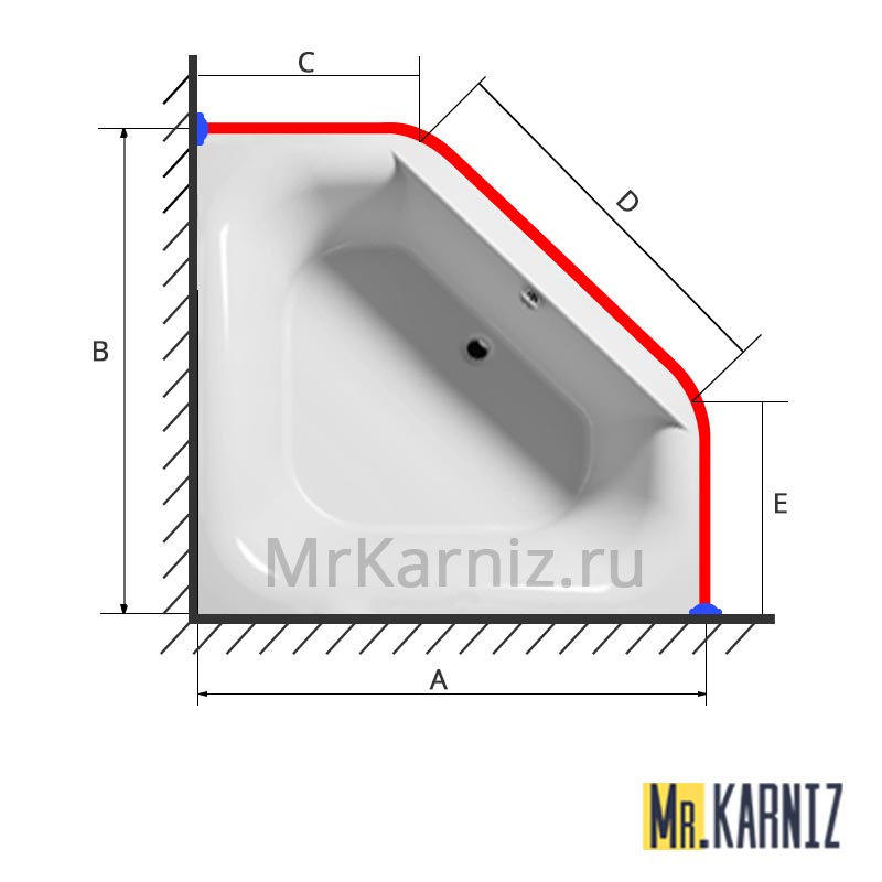 Для их изготовления нам так же необходимо знать длину и ширину ванны ("А" и "В"), так же длины сторон "C", "D" и "E".