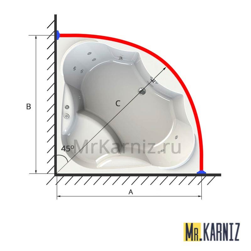 Для их изготовления нам так же необходимо знать длину и ширину ванны ("А" и "В"), а так же биссектрису "С"