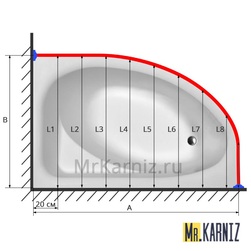 Для их изготовления нам необходимо максимально точно изготовить шаблон, для чего мы в масштабе будем визуализировать изгиб ванны. Для этого нам потребуется так же знать длину и ширину ванны ("А" и "В"), а так же расстояние от длинной стороны ванны до её изгиба (L1,L2...L8) с шагом 10 или 20 см. Чем меньше шаг замеров тем точнее будет изготовлен карниз.